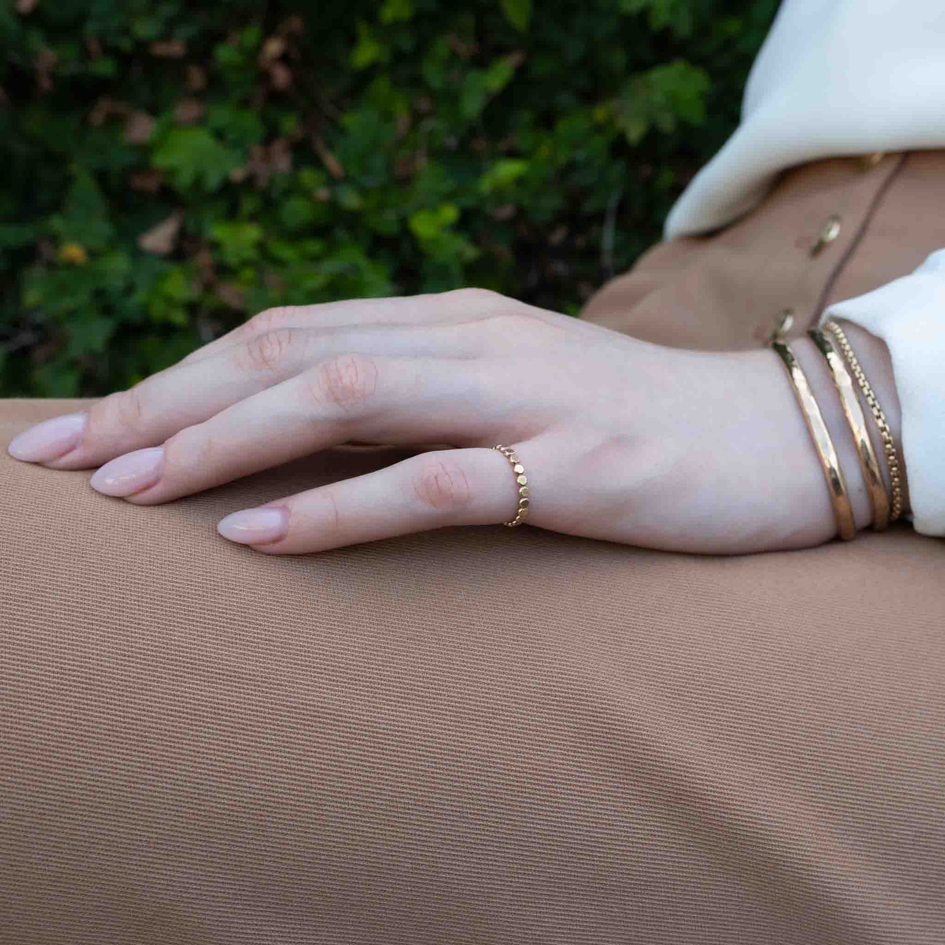 Big Bubbles Stacking Ring — bold, durable, and handmade in Austin, Texas. Crafted in your choice of 14k gold-filled or sterling silver, this waterproof ring features a bubble-textured design that’s made to last. Versatile and stylish, it works beautifully as a pinky ring, midi ring, thumb ring, or classic stacking band. Perfect for everyday wear, this statement piece adds texture and shine whether worn solo or layered with your favorites.