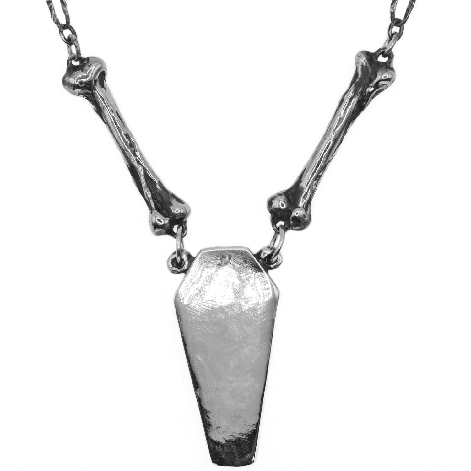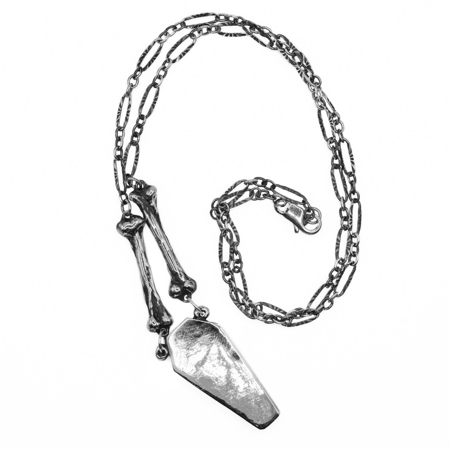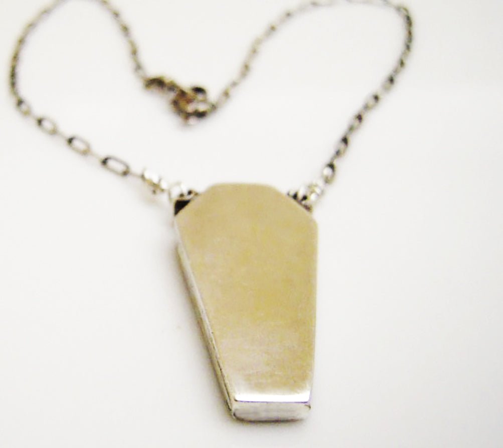 Coffin necklace cast in sterling silver, handmade in Austin Texas.