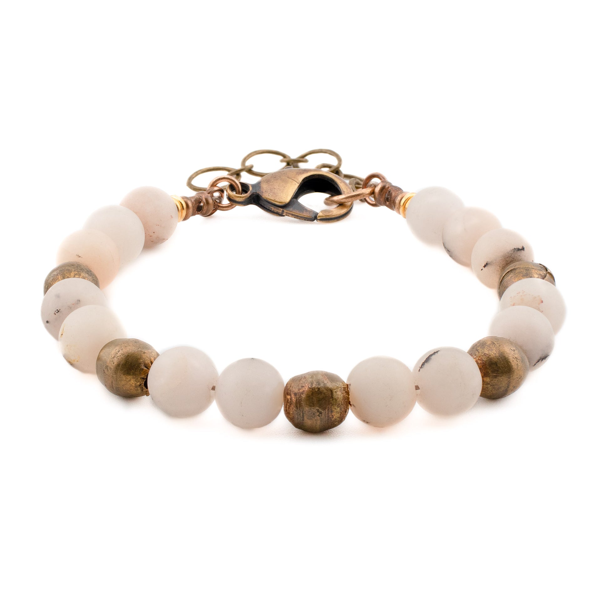 The Pink Opal Yoga Bracelet blends calming beauty with mindful intention. Inspired by traditional mala beads, this bracelet is hand strung in Austin, Texas with natural pink opal stones and finished with sand cast brass beads and durable bronze hardware that will not rust or discolor.