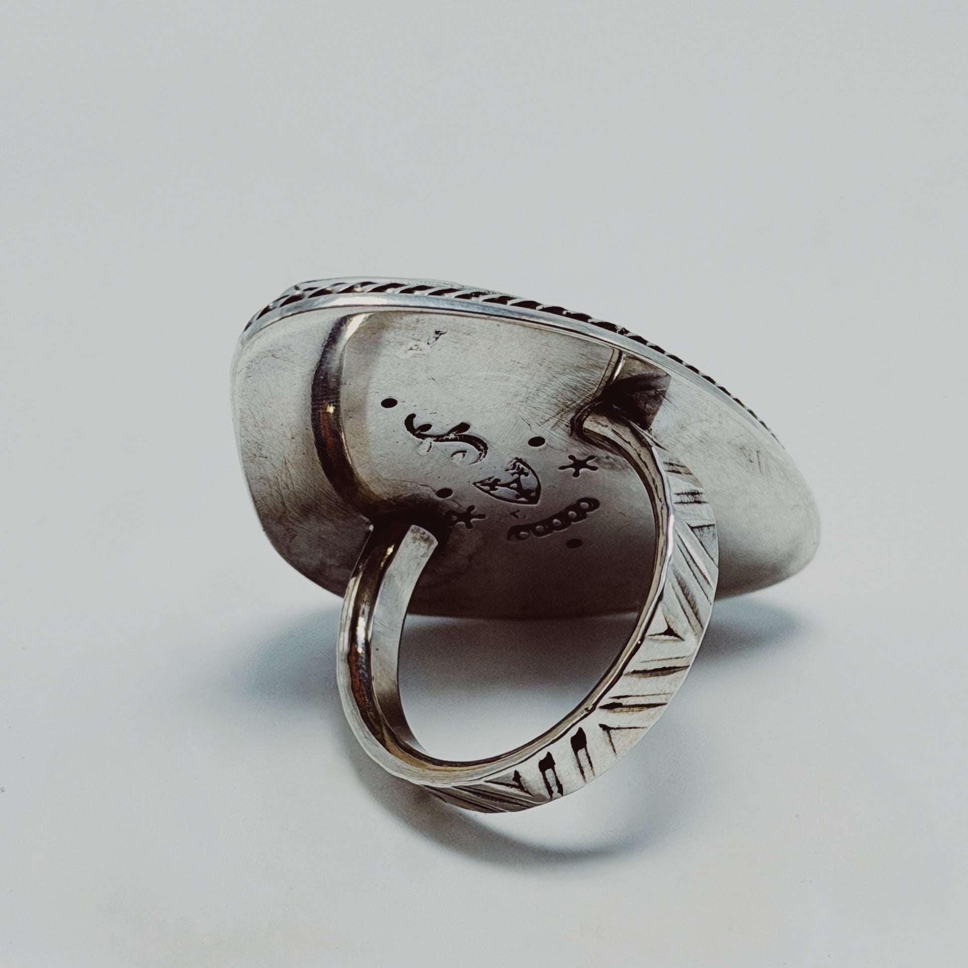 One-of-a-kind grey Jasper angled stone in a size 6.5, set in a hand-built silver bezel with a detailed, classic texture. This ring is completely handmade by us here in Austin, Texas. The stone has rich layers of soft earthy tones that create a beautiful pattern, giving the piece a grounded and natural presence. There is only one, making it a truly unique ring ready for its forever home.