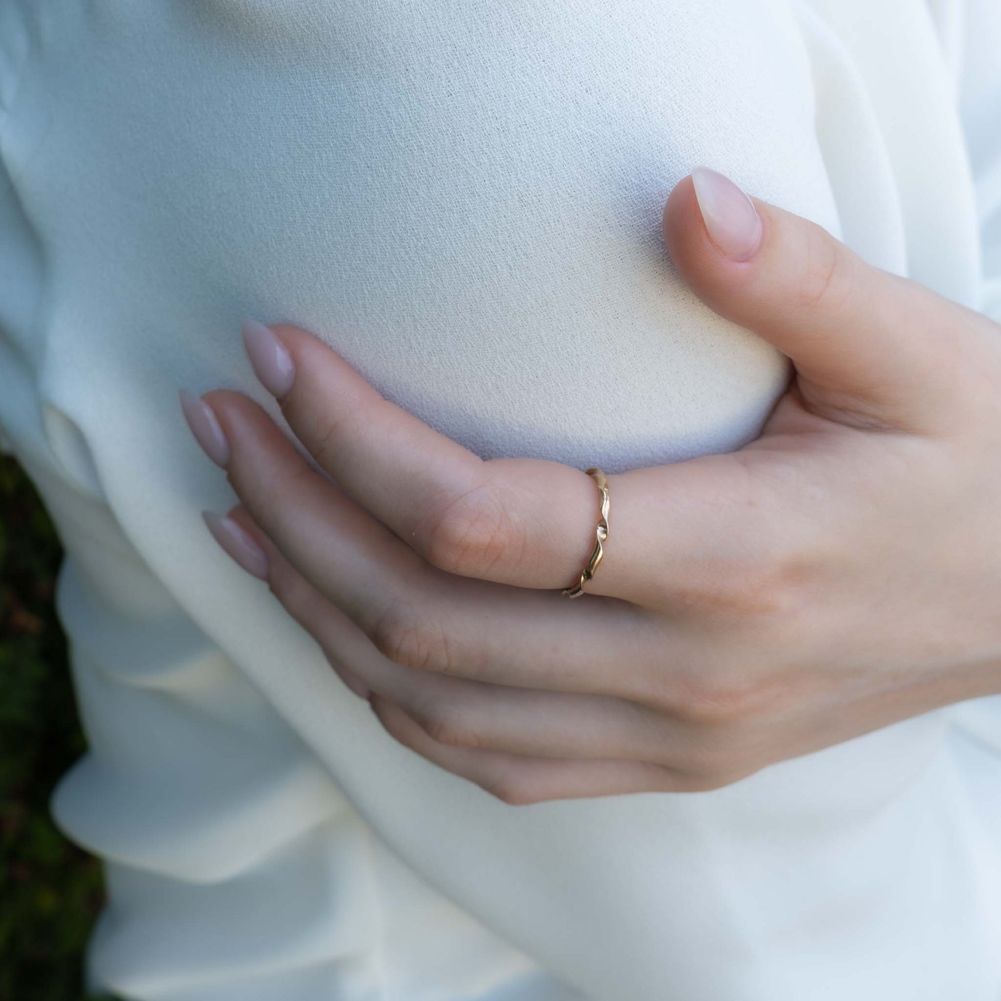 Tiny Twist Stacking Ring — dainty, timeless, and handmade in Austin, Texas. Crafted in 14k gold-filled or sterling silver, this water-safe ring features a delicate twisted design that catches the light from every angle. Versatile and minimal, it’s perfect as a pinky ring, midi ring, thumb ring, or classic stacking band. Designed for everyday wear, this piece layers beautifully with other rings in your collection.